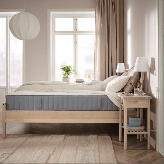 VAGSTRANDA/ヴォーグストランダ マットレスには、こだわり抜いた3つの魅力があります。1つ目は、ダブルポケットコイル。上段のポケットコイルは身体の形にフィットし、下段のポケットコイルは身体からの圧力をしっかり支えます。2つ目は、イケア独自の構造の7つのコンフォートゾーン。腰痛にお悩みの方にもおすすめ。3つ目は、端が補強され、端まで寝込んでも沈みません。マットレスをより広く使え、2つ並べてもつなぎ目が気になりません。このマットレスで贅沢な寝心地を経験したら、その心地よさを人に伝えずにはいられません