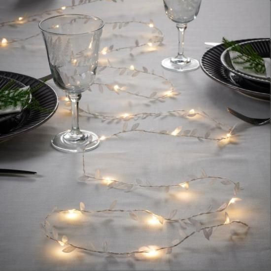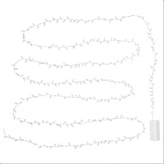 小さなLEDとホワイトのリーフが付いているこの電池式のLEDライトチェーンは心地よい光を放ち、ダイニングテーブルや家の中を輝かせます